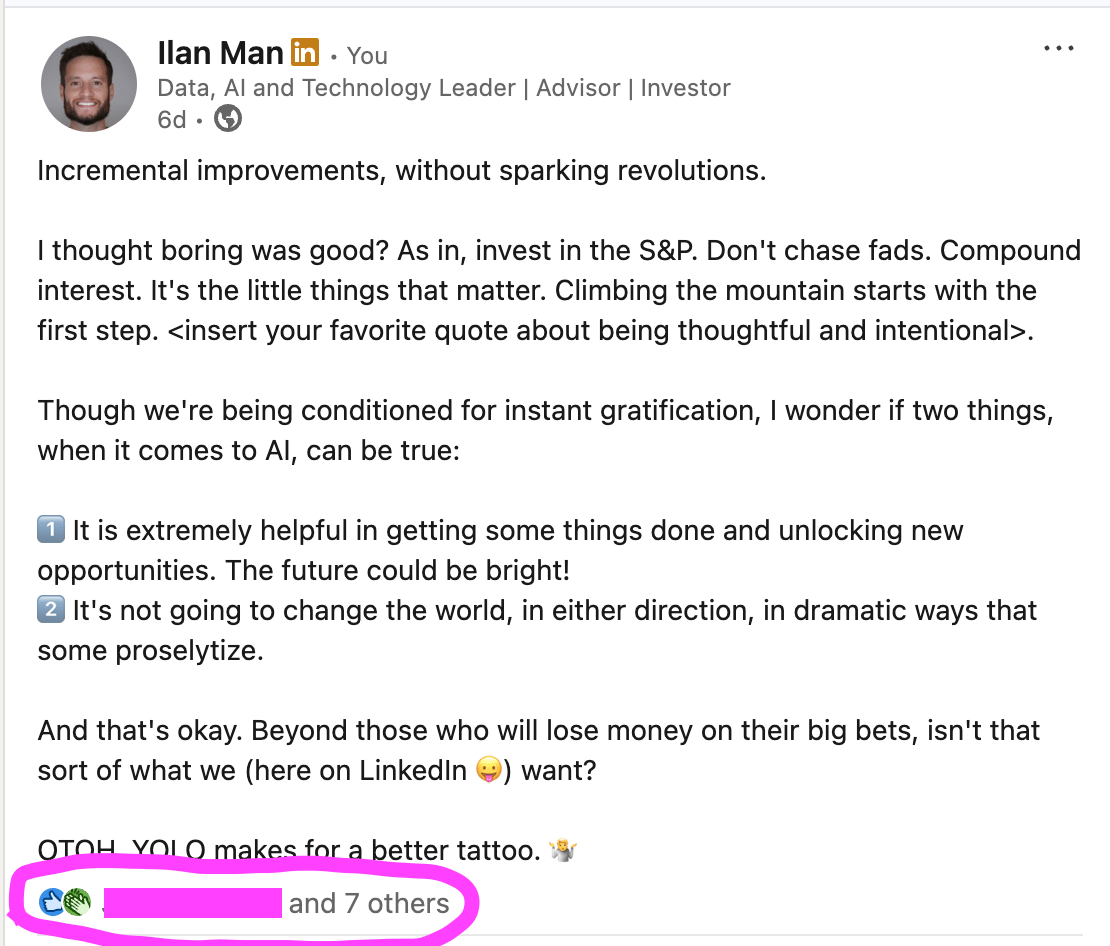 And since these insiders keep investing at higher and higher valuations, they need AI to be world changing, not simply useful. They need it to be revolutionary, not incrementally better. This is the narrative that dominates the news cycle and my LI feed.