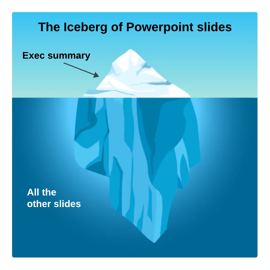 Unfortunately, decision makers never read beyond the executive summary; if you’re lucky, they read the “Next Steps”. So in effect, you aren’t charging $2000 per slide; it’s more like $50K for 5 slides, and $0 for the remaining 120.